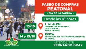 Este fin de semana, los centros comerciales de Monte Grande y El Jagüel serán peatonales para que las vecinas y los vecinos se acerquen con mayor comodidad a realizar las compras por el Día de la Familia.