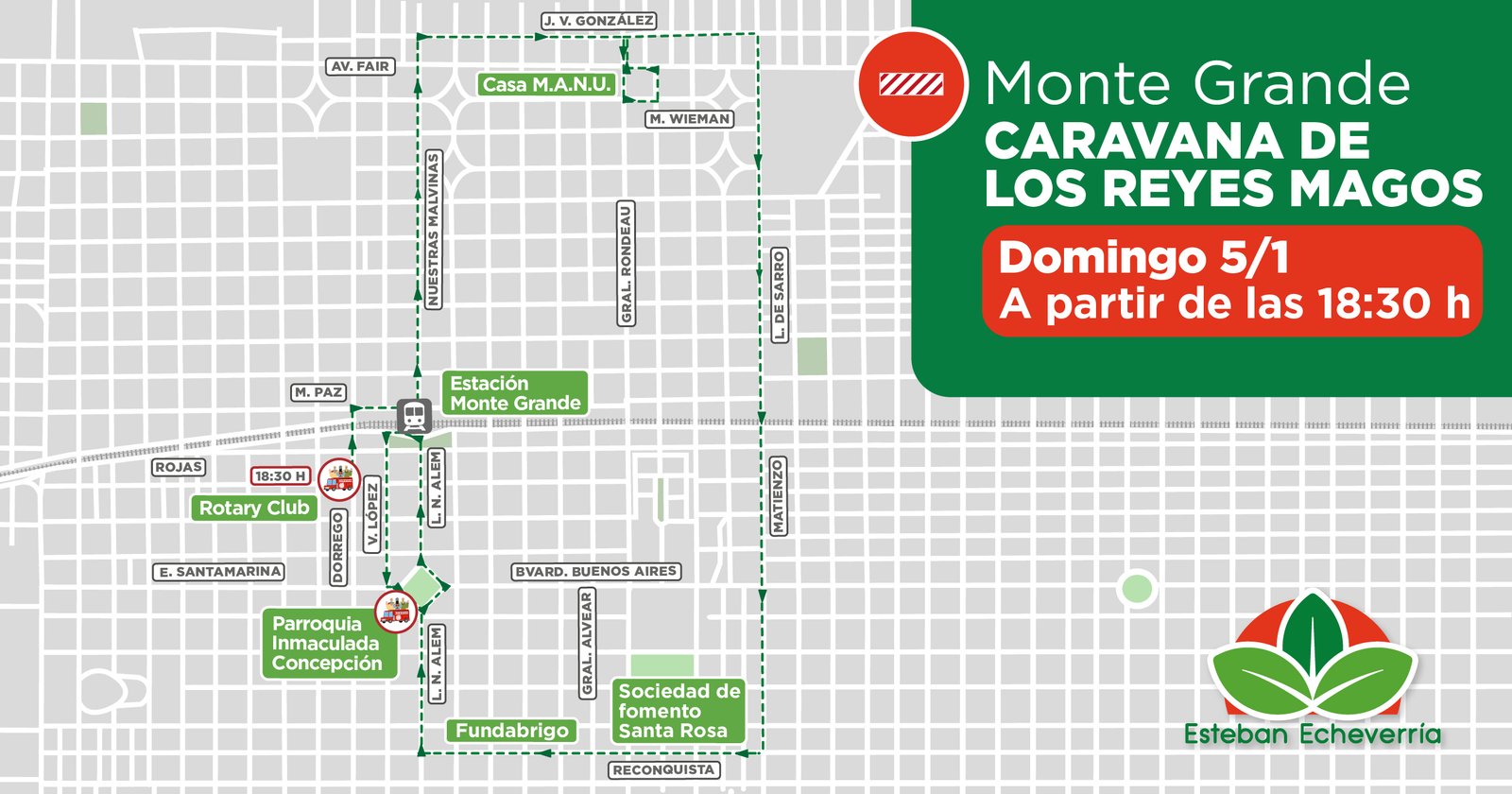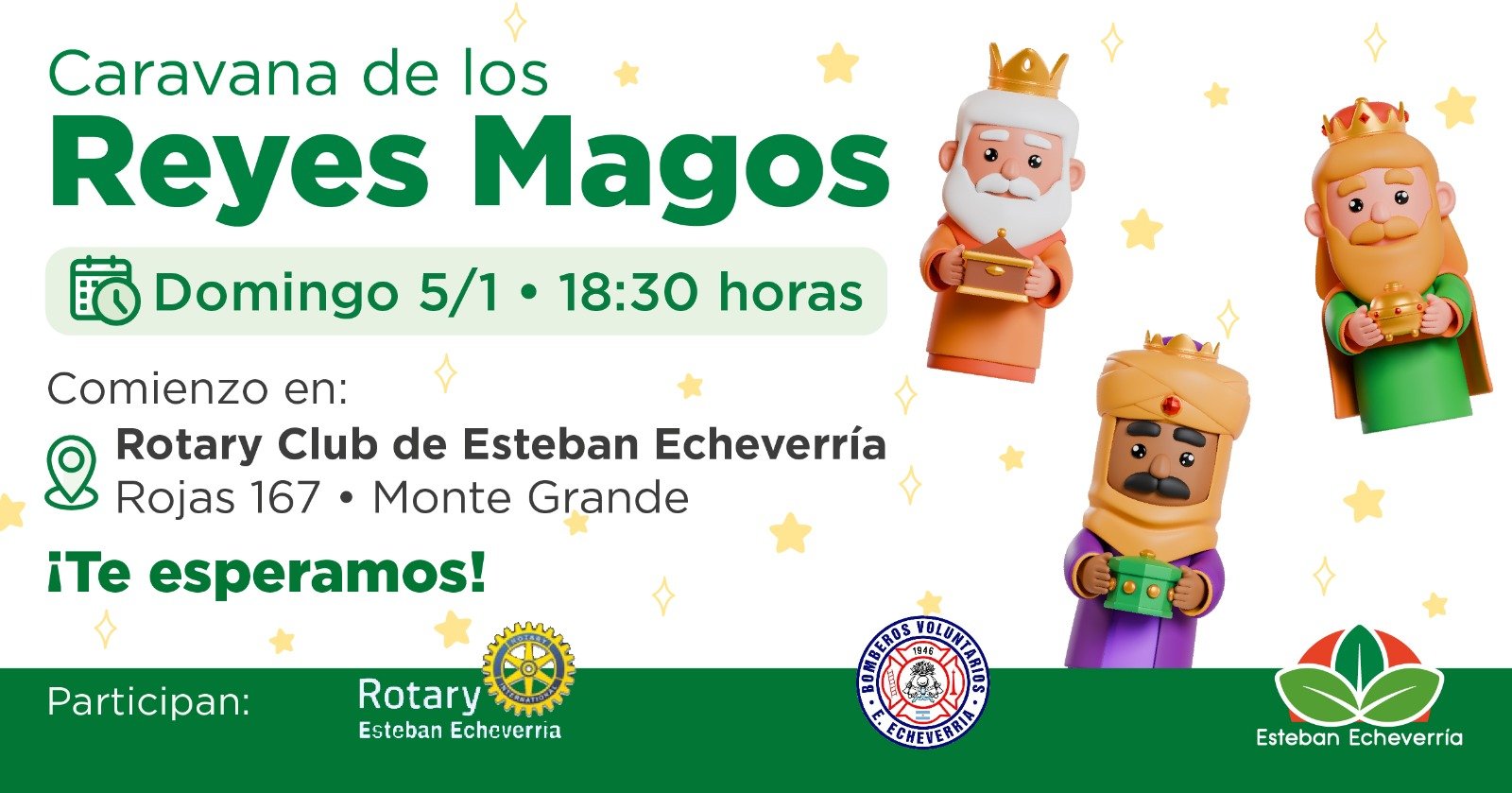 Organizada por el Municipio de Esteban Echeverría y el Rotary Club local, la caravana de los Reyes Magos partirá desde la sede del Rotary, en la calle Rojas al 100. El recorrido continuará por las calles Dorrego, Máximo Paz, Nuestras Malvinas y J. V. González, y pasará por Casa M.A.N.U. Luego, seguirá por Luis de Sarro, Matienzo, Reconquista, Alem, Petrazzini y Vicente López, y finalizará en la plaza Mitre.