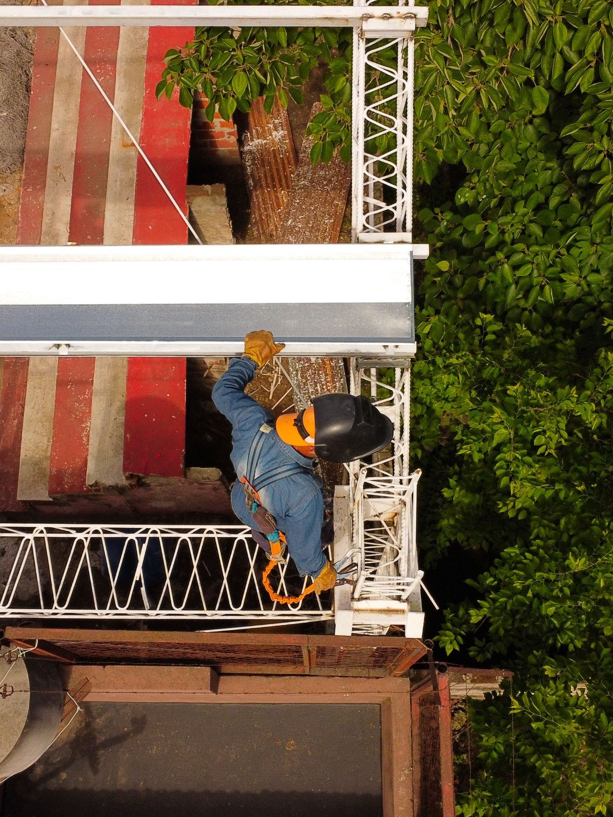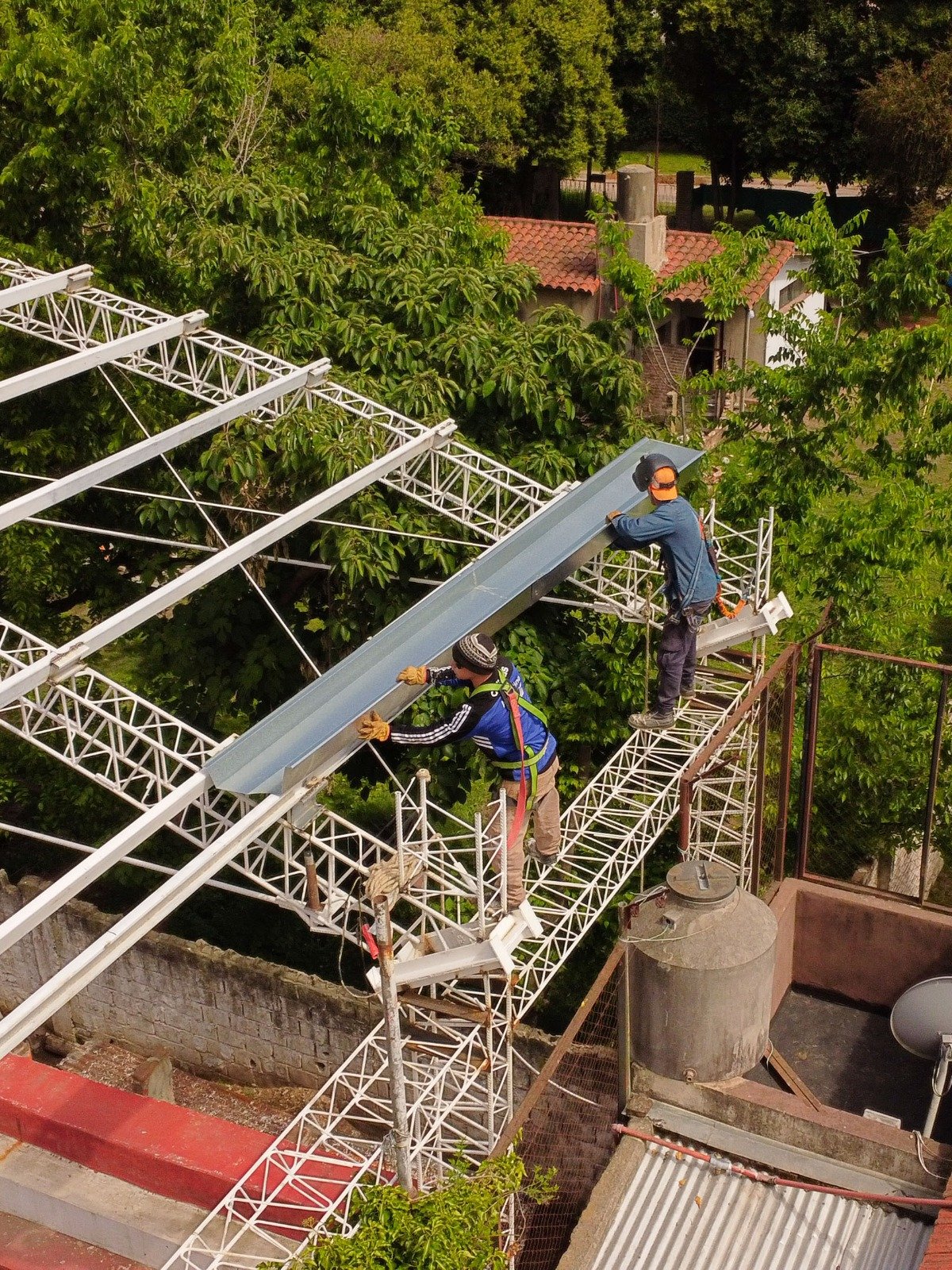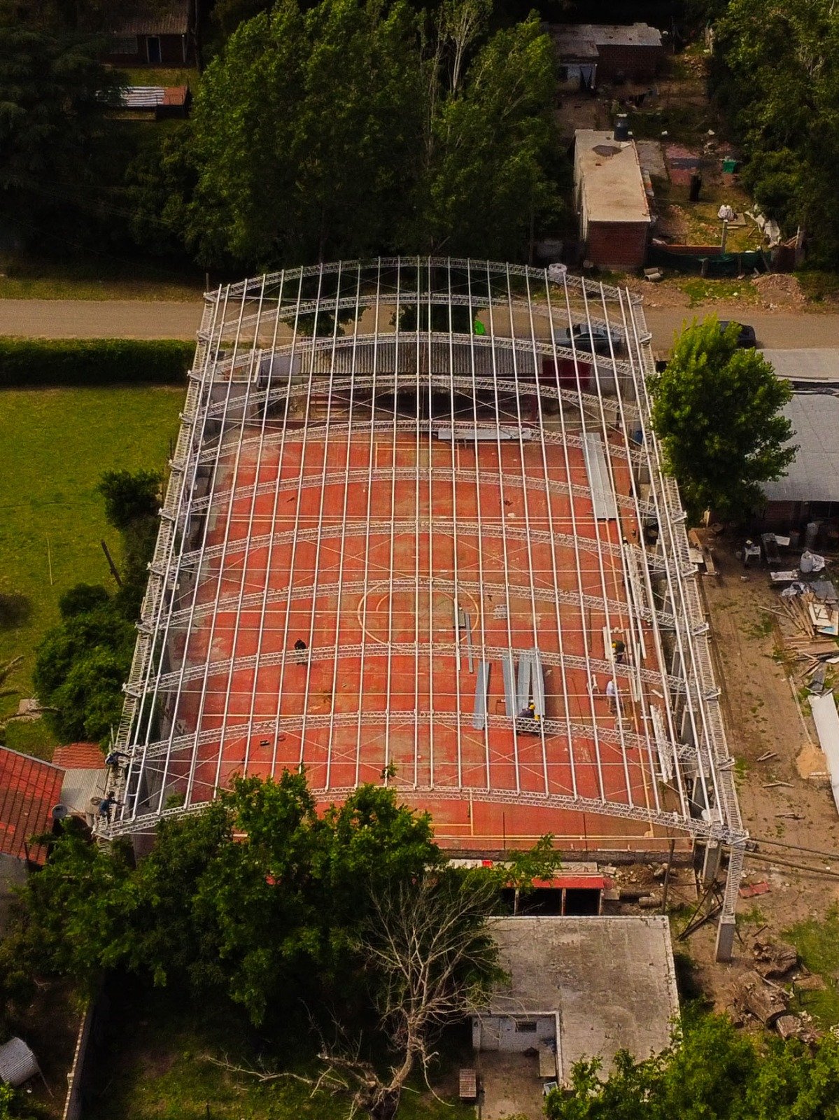 La obra consiste en el armado de un techo parabólico tradicional con cubierta de chapas cincalum sobre perfilería galvanizada y vigas reticuladas que tienen apoyo en bases y columnas de hormigón armado. En forma complementaria, se realizan las instalaciones eléctrica y pluvial, la pintura de playón, la colocación de redes que cercan la estructura y la colocación de polietileno de alta densidad para proteger las columnas.