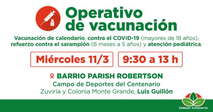 El Municipio de Esteban Echeverría realizará nuevos operativos territoriales de vacunación en distintas localidades del distrito. El miércoles 11 de marzo, de 9:30 a 13 horas, la jornada se llevará a adelante en el Campo de Deportes del Centenario (Zuviría y Colonia Monte Grande, barrio Parish Robertson), en Luis Guillón.