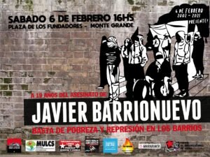 Organizaciones políticas y sociales realizarán mañana sábado, desde las 16 frente a la estación ferroviaria de Monte Grande, Esteban Echeverría, un encuentro homenaje para Javier Barrionuevo, el militante del MTD asesinado durante una jornada piquetera en la Ruta 205 a la altura de El Jagüel en un episodio que vinculó a un conductor que insistentemente quiso pasar por entre la protesta abriendo fuego contra los manifestantes: Jorge Bogado, personaje ligado a la política local.