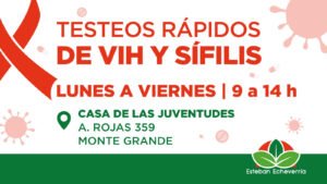 De lunes a viernes, de 9 a 14 horas, vecinas y vecinos mayores de 13 años pueden acceder al test rápido, gratuito, voluntario y confidencial de VIH y sífilis que el área de Salud del Municipio de Esteban Echeverría realiza en la Casa de las Juventudes (Rojas 359, Monte Grande).