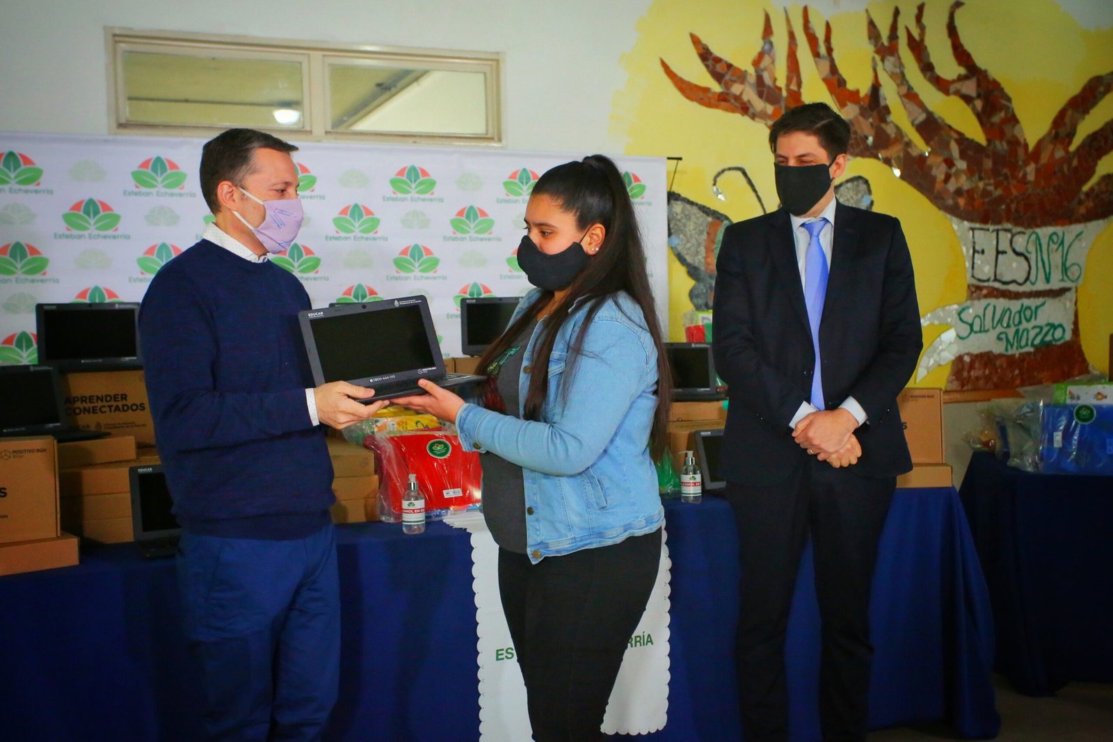 Durante la jornada, y bajo estrictos protocolos sanitarios, Fernando Gray y Nicolás Trotta realizaron la entrega de netbooks a niñas y niños de la Escuela Secundaria N° 16, la cual recibió un total de 121 computadoras, en continuidad con las 1607 que van a ser entregadas en una primera etapa en 19 instituciones públicas de Esteban Echeverría.