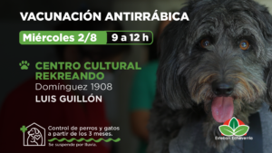 El miércoles 2 de agosto, de 9 a 12 horas, los equipos de trabajo del Municipio de Esteban Echeverría realizarán una nueva jornada de vacunación antirrábica para perros y gatos mayores de tres meses en el Centro Cultural Rekreando (Domínguez 1908, Luis Guillón).