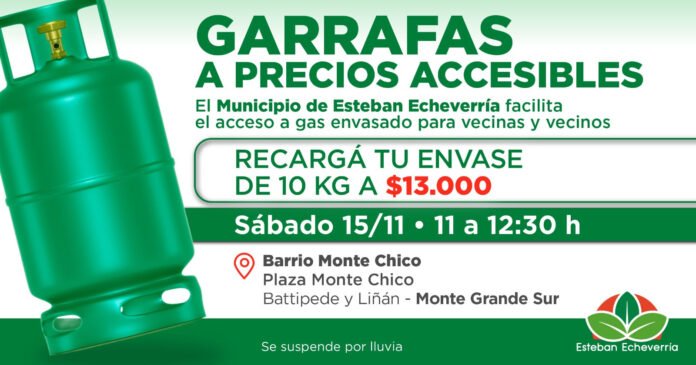 El sábado 15 de noviembre, de 11 a 12:30 horas, los equipos del Municipio de Esteban Echeverría realizarán un operativo de recarga de garrafas a precio accesible. En esta oportunidad, el mismo tendrá lugar en la Plaza Monte Chico, ubicada en P. de Battipede y Leopoldo Liñán, en Monte Grande Sur.