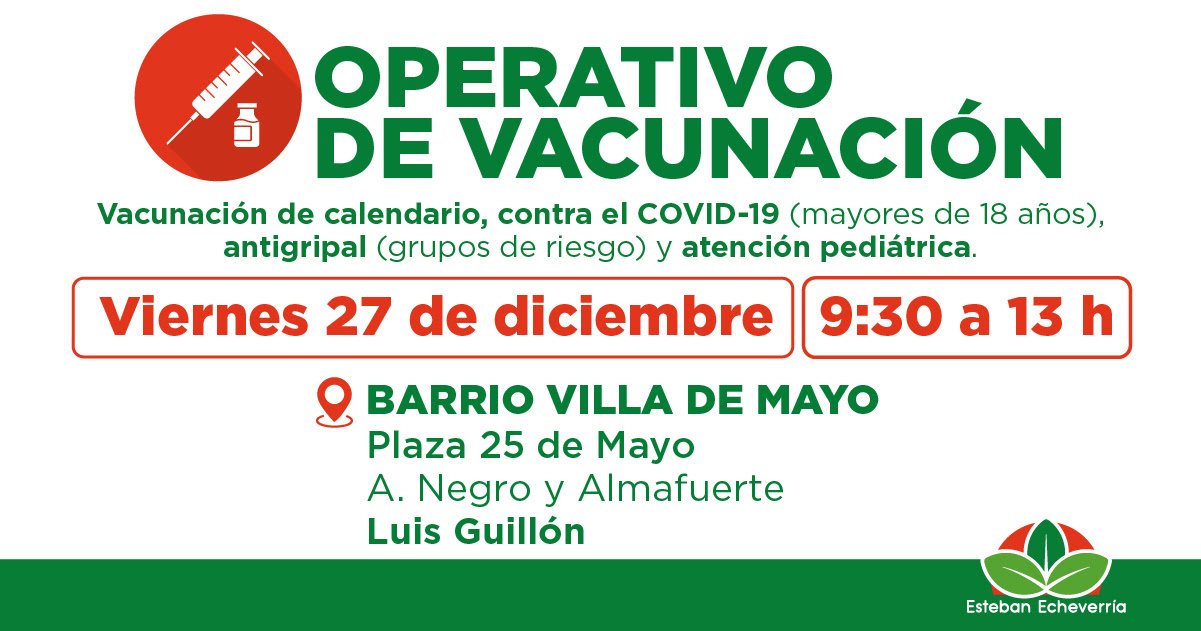El Municipio de Esteban Echeverría realizará operativos territoriales de vacunación en distintas localidades del distrito. La jornada se llevará a cabo el viernes 27 de diciembre de 9:30 a 13 horas, en Luis Guillón.