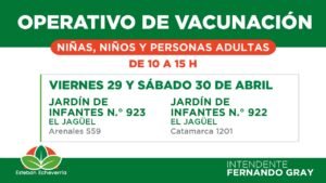 En continuidad con los operativos móviles de aplicación de dosis del Calendario Nacional (vacunas gratuitas y obligatorias para toda la comunidad) y de la vacuna antigripal para menores entre 6 y 24 meses de edad, el Municipio de Esteban Echeverría llevará a cabo nuevas jornadas de vacunación en la localidad de El Jagüel.