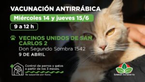 Los días miércoles 14 y jueves 15 de junio, el Municipio de Esteban Echeverría llevará a cabo jornadas de vacunación antirrábica y control de salud para perros y gatos a partir de los tres meses de edad. Se realizarán de 9 a 12 horas en la sede de Vecinos Unidos de San Carlos 2, ubicada en Don Segundo Sombra 1542 (9 de Abril).