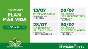 Las jornadas se llevarán adelante mañana martes 13 y el martes 20 de julio, 10 a 14 hs, en la calle Santa Inés y Solís, Transradio, 9 de Abril; en el comedor Los Pichoncitos, ubicado en Berasain 2285, El Jagüel.