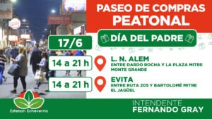 El sábado 17 de junio, de 14 a 21 horas, las calles Alem (Monte Grande) y Evita (El Jagüel) serán peatonales. Esta iniciativa —llevada a cabo durante la jornada previa al Día del Padre— tiene como objetivo fomentar la actividad comercial local.