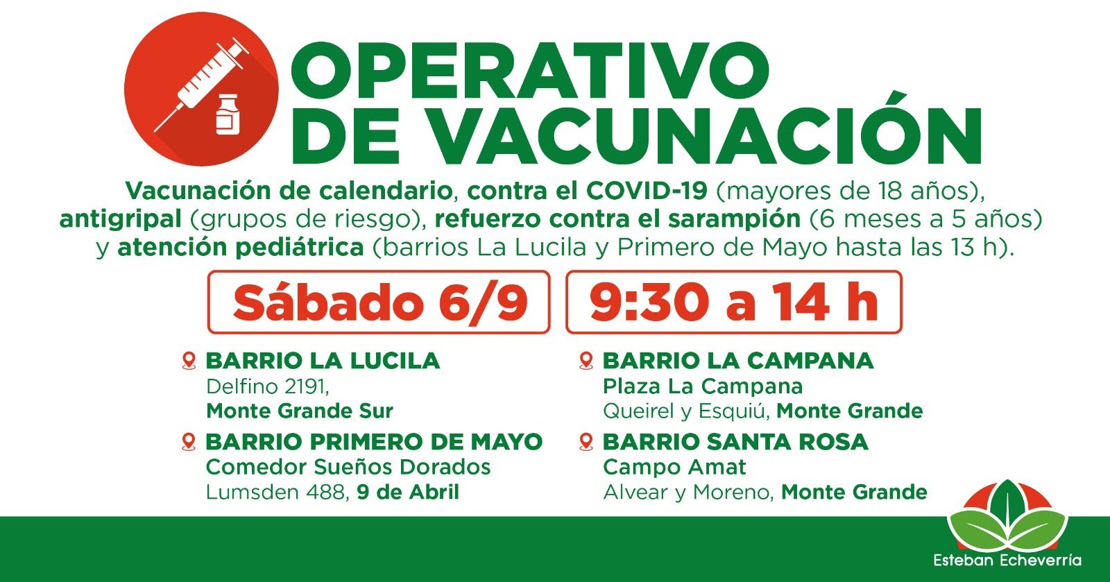 Este sábado 6 de septiembre, el Municipio de Esteban Echeverría realizará una jornada territorial con doble foco en salud y acceso energético. De 9:30 a 14 horas, se llevarán a cabo operativos gratuitos de vacunación en distintos puntos de 9 de Abril, Monte Grande y Monte Grande Sur. En paralelo, de 11 a 12:30, se desarrollará un operativo de recarga de garrafas a precio accesible en el barrio La Lucila.