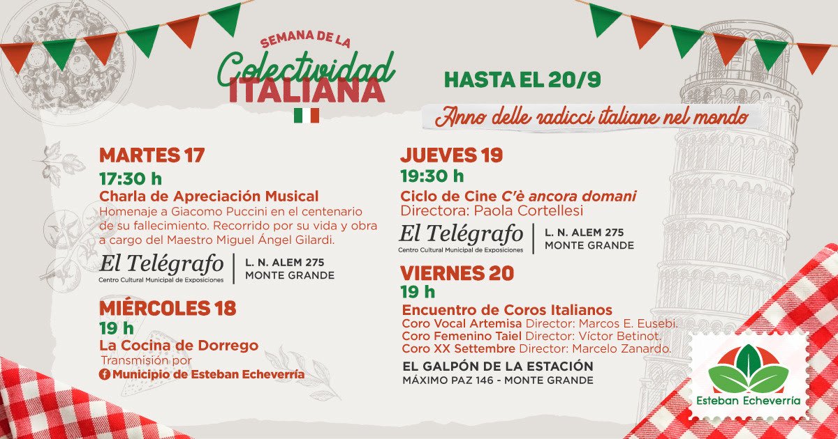 Hasta el viernes 20 de septiembre, el Municipio de Esteban Echeverría organiza la Semana de la Colectividad Italiana, celebración que conmemora un nuevo aniversario de la unificación italiana.