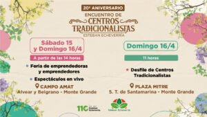 En el marco del 20° Encuentro de Centros Tradicionalistas de Esteban Echeverría, durante el próximo fin de semana se realizarán espectáculos en vivo en Campo Amat (Alvear y Manuel Belgrano, Monte Grande) y el domingo el clásico desfile en la plaza Mitre.