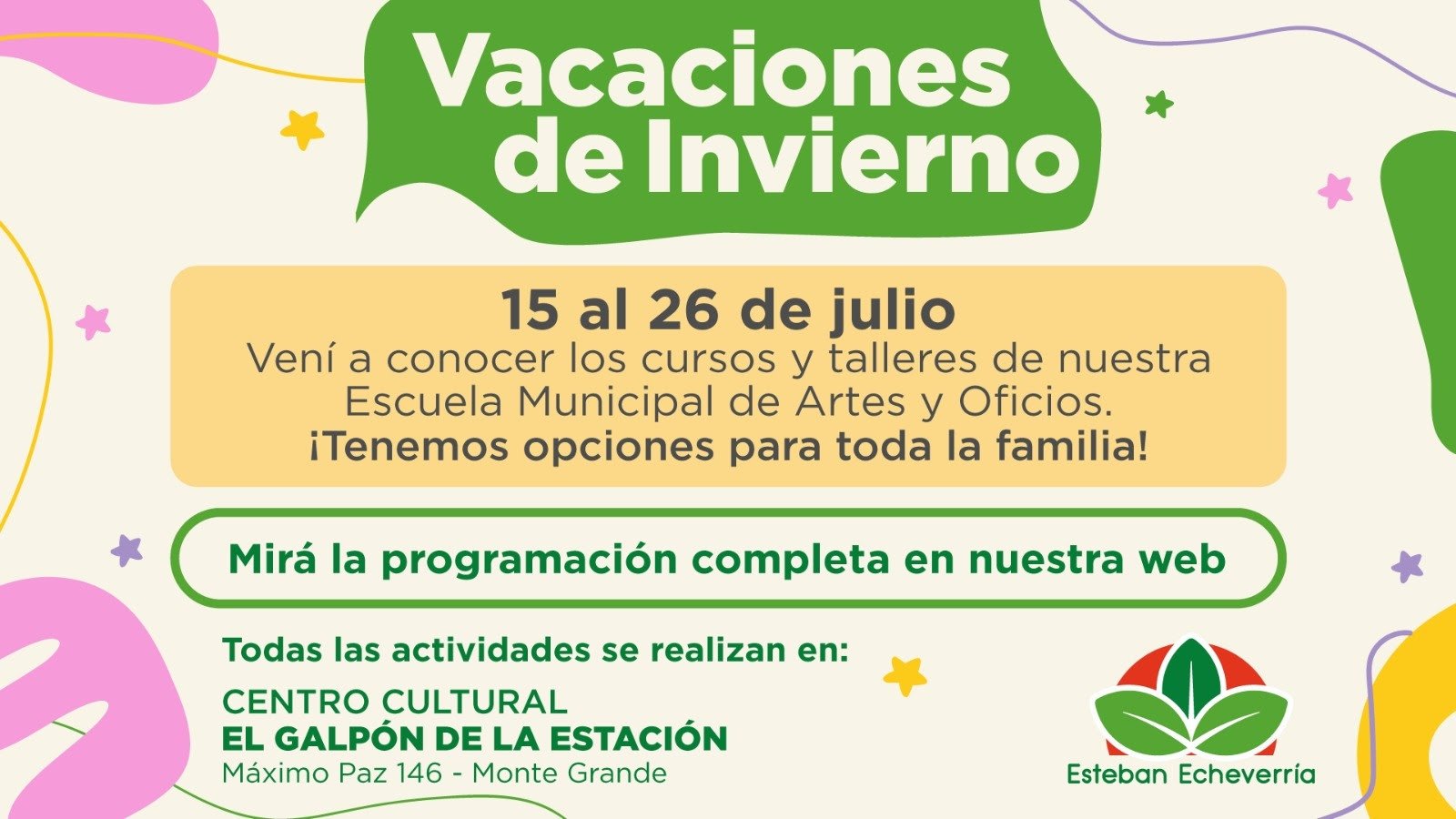 Durante las vacaciones de invierno, el Municipio de Esteban Echeverría, a través de la Escuela Municipal de Artes y Oficios, realizará cursos y talleres para toda la familia.
