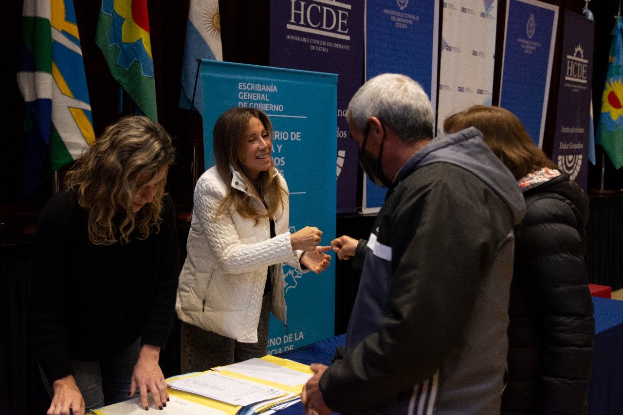 La Presidenta del Honorable Concejo Deliberante de Ezeiza, Dulce Granados, junto al Intendente Interino, Gastón Granados y la escribana Maria Laura Matioli, de la Escribanía General de Gobierno dependiente del Ministerio de Justicia y Derechos Humanos de la Provincia de Buenos Aires, llevaron a cabo la firma de 29 escrituras, para beneficiar a vecinos y vecinas de Ezeiza.