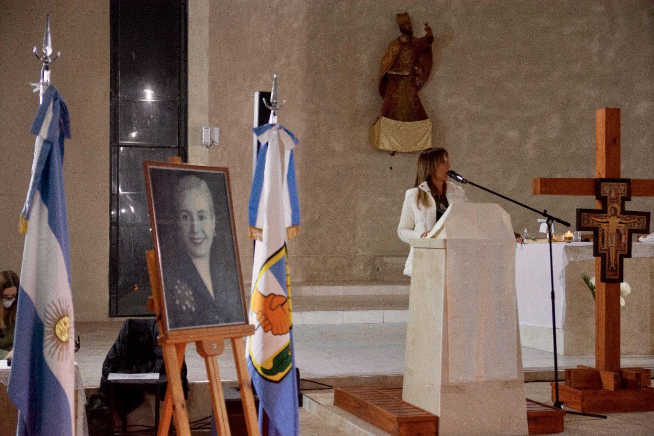 Una vez en la Iglesia, el Padre Gabriel llevó adelante la misa ante la atenta mirada de toda la concurrencia y seguidamente Dulce Granados descubrió un cuadro con la imagen de Evita y tomó la palabra para recordar a la «Abanderada de los humildes».