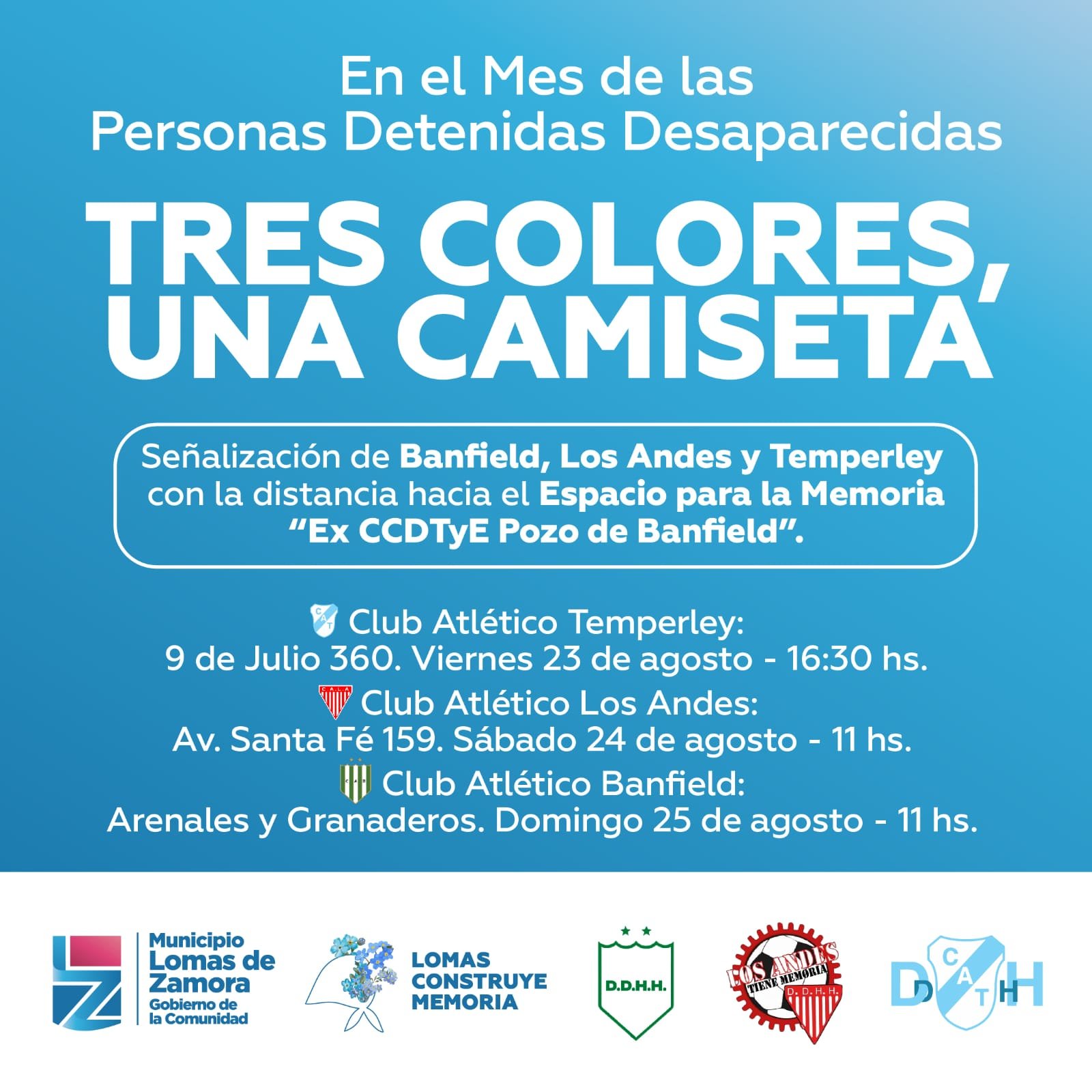 En el marco del Mes de las Personas Detenidas-Desaparecidas, la Subsecretaría de Derechos Humanos del Municipio de Lomas de Zamora en articulación con la Subcomisión de DDHH del Club Banfield, el Departamento de Derechos Humanos del Club Temperley y el Colectivo Los Andes Tiene Memoria, señalizarán la distancia hacia el Espacio para la Memoria «Ex CCDTyE Pozo de Banfield» en estos clubes.
