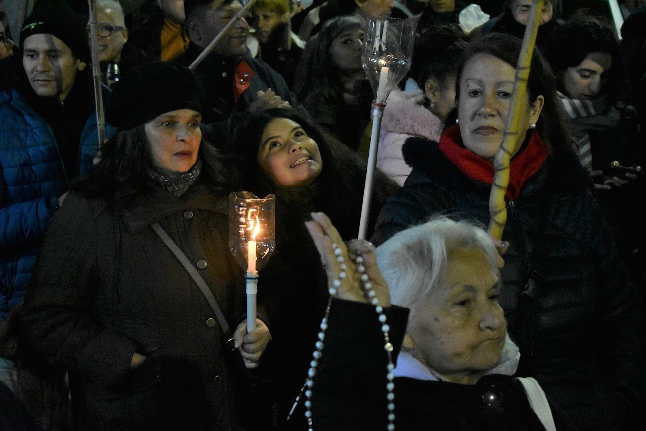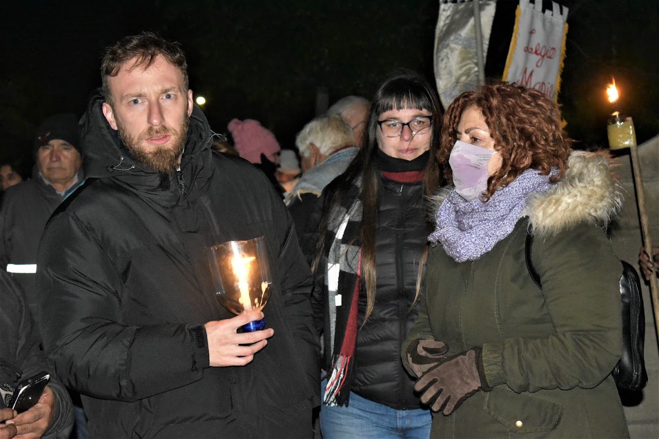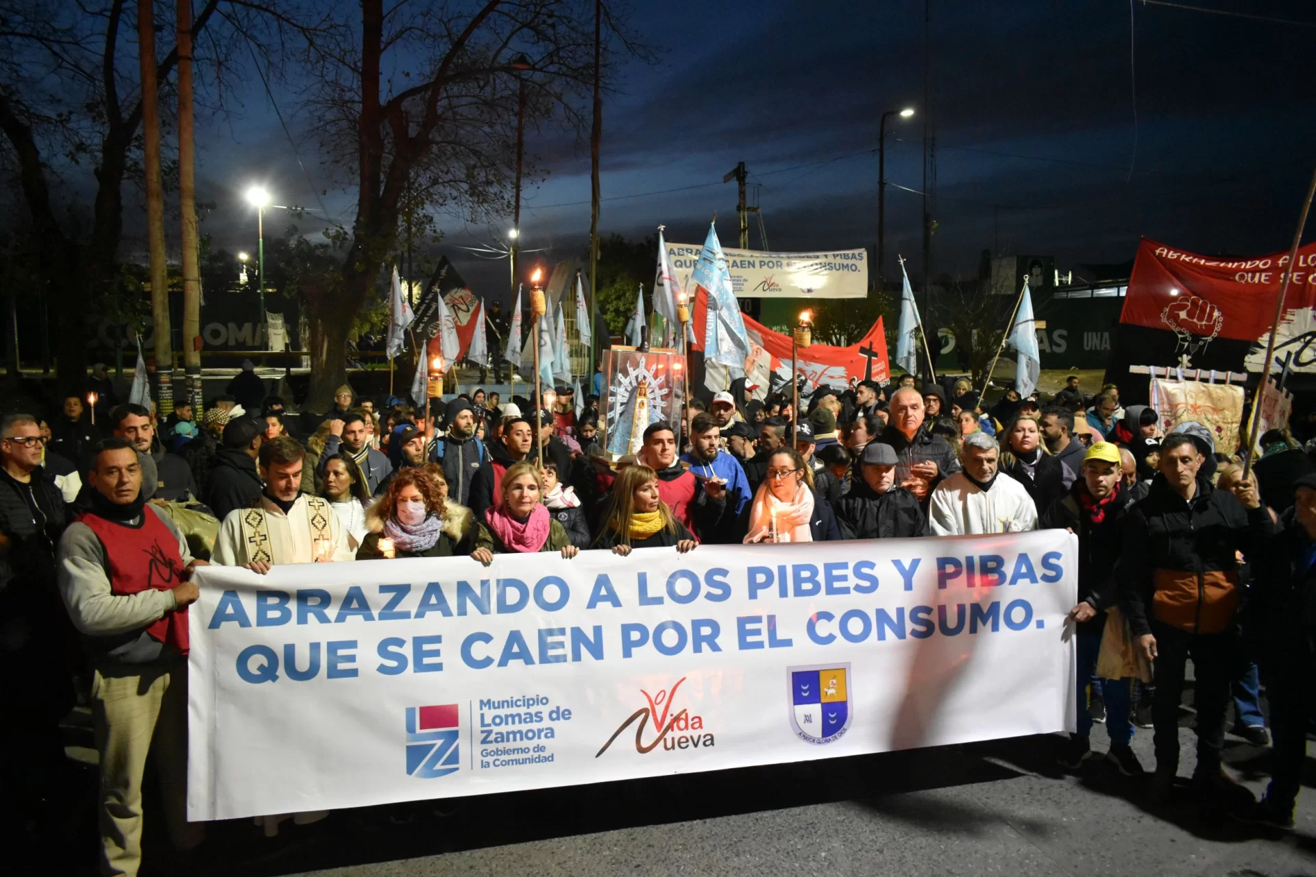 Chicos y chicas en recuperación de las adicciones que forman parte de distintas comunidades de la Fundación Vida Nueva, familiares y referentes de grupos y pastorales de la Iglesia diocesana caminaron unas 10 cuadras de la localidad de Fiorito, en el partido de Lomas, bajo el lema: “Abrazando a los pibes y pibas que se caen por el consumo”, y lo hicieron con velas y antorchas “como representación de la esperanza”, según habían anticipado, hasta el santuario ubicado en Au. Presidente Perón (“Camino Negro”) y Quesada, muy próximo al Puente La Noria, donde el obispo, al final de la caminata, bendijo una imagen de Nuestra Señora de Guadalupe, patrona de Latinoamérica.