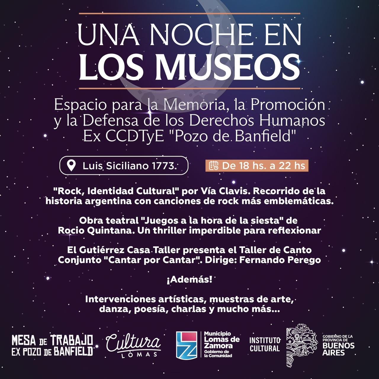 Agradeciendo la invitación para ser parte de esta iniciativa, les compartimos la propuesta del Espacio para la Memoria Pozo de Banfield para este Sábado 18 de Mayo desde las 18.00 Hs hasta las 22.00 Hs.