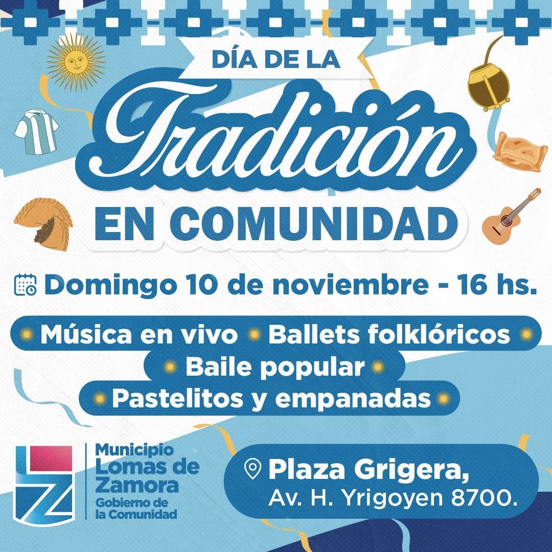 El Municipio de Lomas de Zamora invita a sus vecinos y vecinas a formar parte de los festejos por el Día de la Tradición este domingo 10 de noviembre, a partir de las 16, con un evento libre y gratuito a realizarse en el Polo Cultural de la Plaza Grigera (Av. Hipólito Yrigoyen 8700).