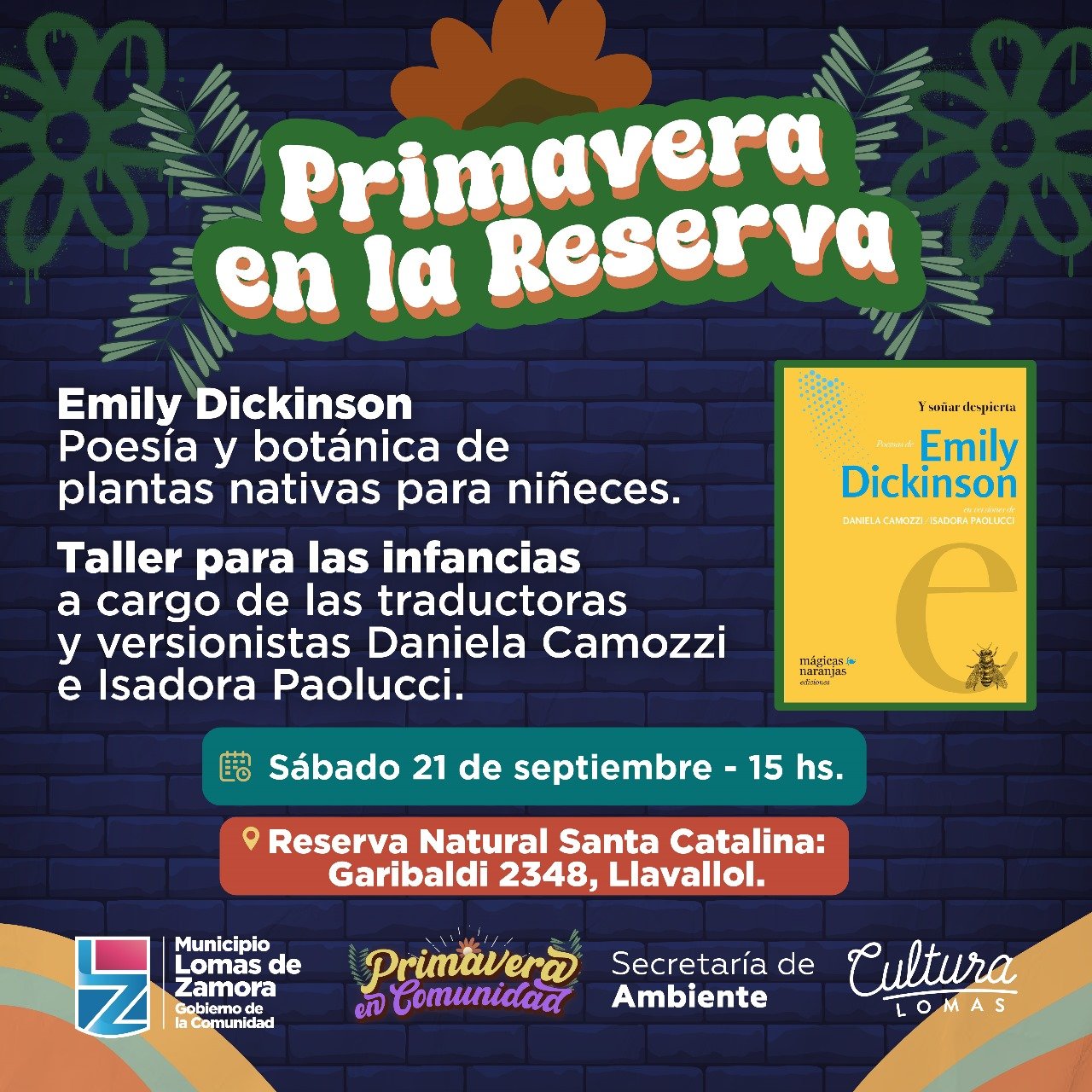 Este sábado 21 de septiembre se llevará a cabo un “Taller para las Infancias” en la Reserva de Santa Catalina. La actividad es organizada por la Municipalidad de Lomas de Zamora y se presentará el libro «Y soñar despierta», versión bilingüe, de la poeta naturalista estadounidense Emily Dickinson.