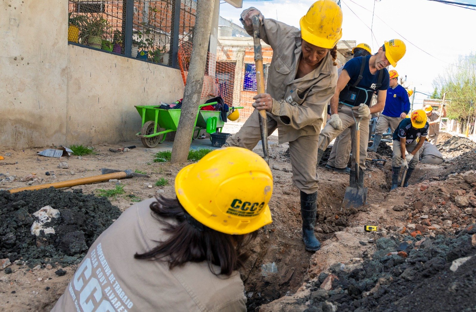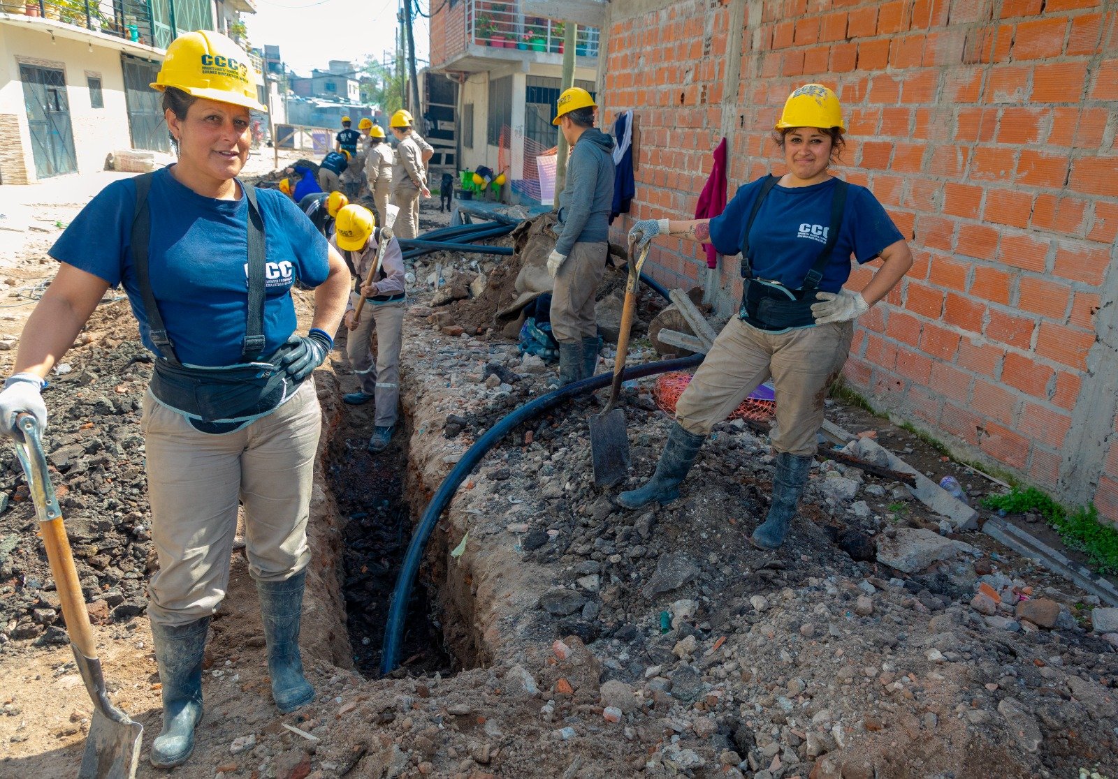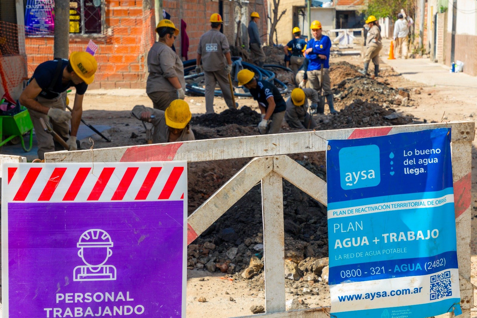 Estas obras son llevadas adelante por cooperativas locales, bajo la supervisión de AySA, en el marco de los programas A+T y C+T (Agua + Trabajo y Cloaca+Trabajo). Esta modalidad permite la creación de puestos de trabajo genuinos con equipos conformados por vecinas y vecinos del municipio donde se está llevando adelante la obra y en todos los casos, con paridad de género, para que puedan acceder al oficio sanitarista, tanto hombres como mujeres.