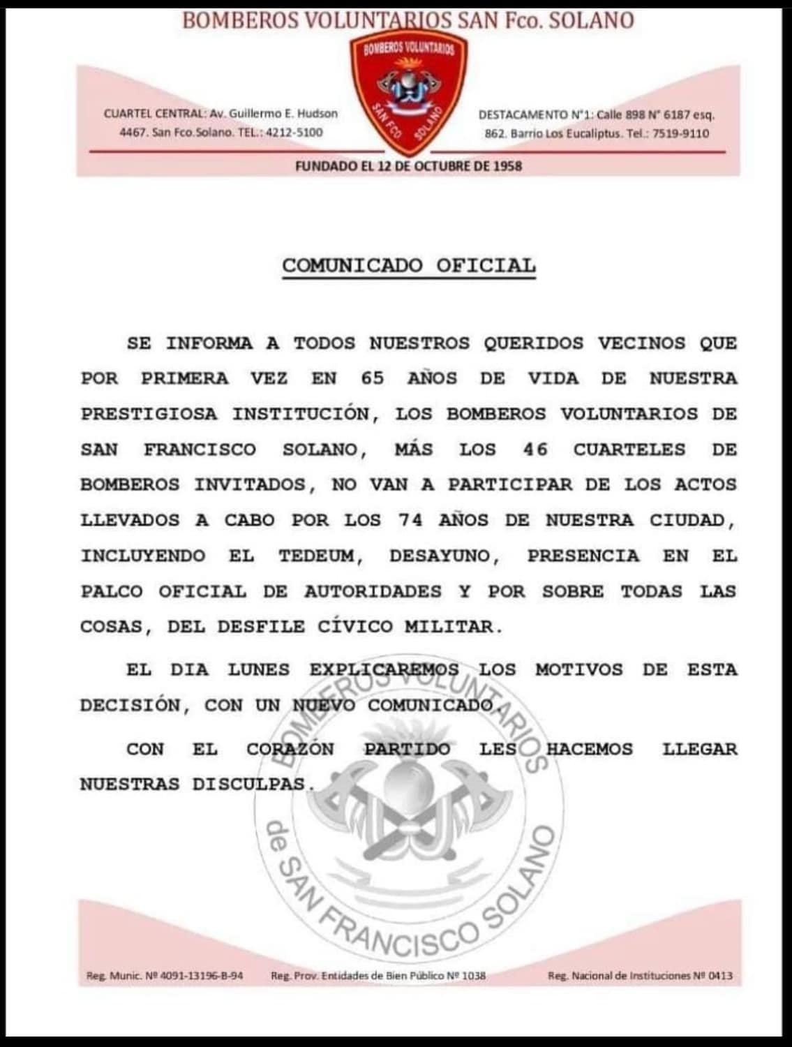 «Después de muchos años de historia, ocurrió algo inimaginable: no desfilamos», comienza la misiva publicada por los Bomberos Voluntarios de San Francisco Solano que, en su pesar, dijeron «no» a ser parte de los festejos de hoy por los 74 años de vida de la localidad quilmeña, y lo hicieron como respuesta a los dichos de la intendenta Mayra Mendoza quien se refirió con duros términos a la entidad por haber recibido semanas atrás a la candidata a la vicepresidencia de la nación por La Libertad Avanza, Victoria Villarruel.