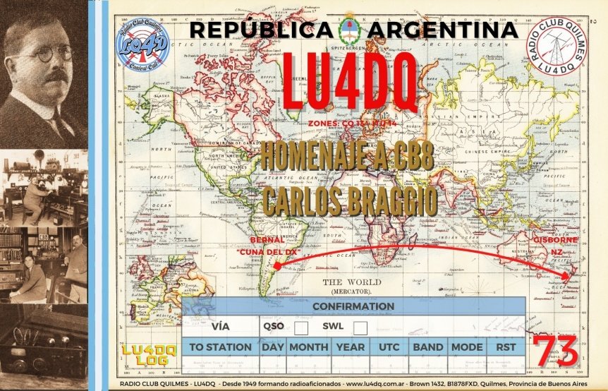 En la noche del 20 al 21 de mayo de 1924, la Radioafición argentina conquistó el récord mundial de intercomunicaciones gracias al distinguido radioaficionado Don Carlos Braggio, quien utilizó un transmisor de 200 vatios y un receptor, ambos de construcción propia. Estos equipos estaban instalados en su domicilio en la ciudad de Bernal, partido de Quilmes, Buenos Aires. La estación, identificada con el indicativo CB8, estableció una comunicación de dos horas con el señor Ivan O’Meara Z2AC, residente de Gisborne, Nueva Zelanda, marcando así el récord mundial de distancia en más de 10.000 kilómetros.