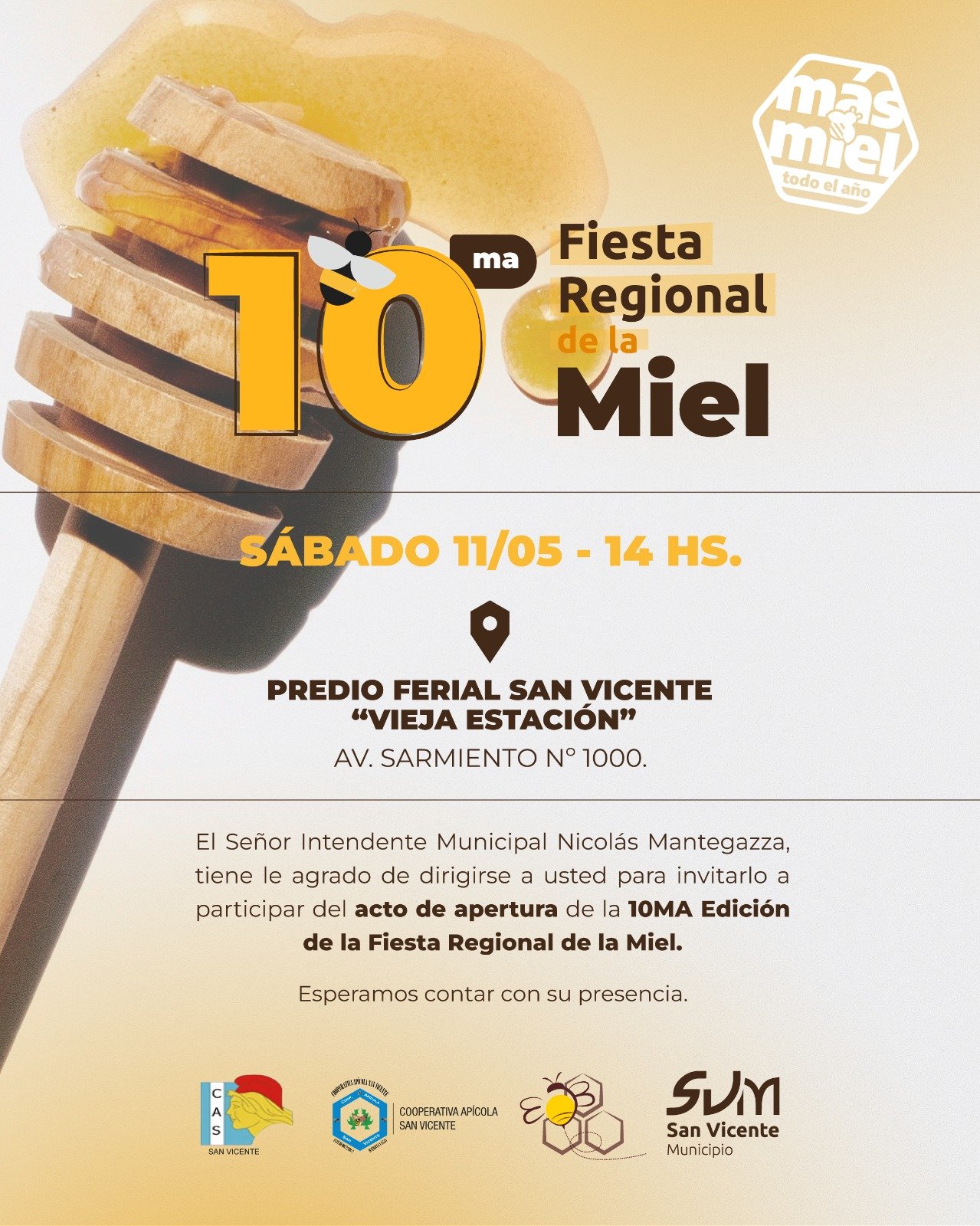 El próximo sábado 11 y domingo 12 de mayo se realizará la 10° Fiesta Regional de la Miel en el predio Ferial Vieja Estación, organizada por el Club Argentino de Servicios de San Vicente (CAS), con el apoyo de la Municipalidad.