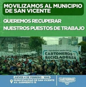 “El intendente de San Vicente, Nicolás Mantegazza, no deja entrar a los recicladores de la Cooperativa “La Familia” al Ecopunto municipal para realizar su trabajo, sin explicación alguna. No hay respuesta lógica de por qué, después de más de 10 meses, las autoridades no dejan trabajar a más de 20 familias que viven de revolver la basura para juntar materiales reciclables”, explicaron a través de un comunicado desde la Federación Argentina de Cartoneros, Carreros y Recicladores – UTEP-, al confirmar la movilización a la intendencia para esta mañana.