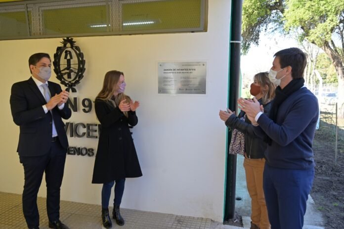 La directora general de Cultura y Educación de la Provincia, Agustina Vila, inauguró el nuevo edificio del Jardín de Infantes 916 de San Vicente, junto al ministro de Educación de la Nación, Nicolás Trotta y el intendente local, Nicolás Mantegazza.