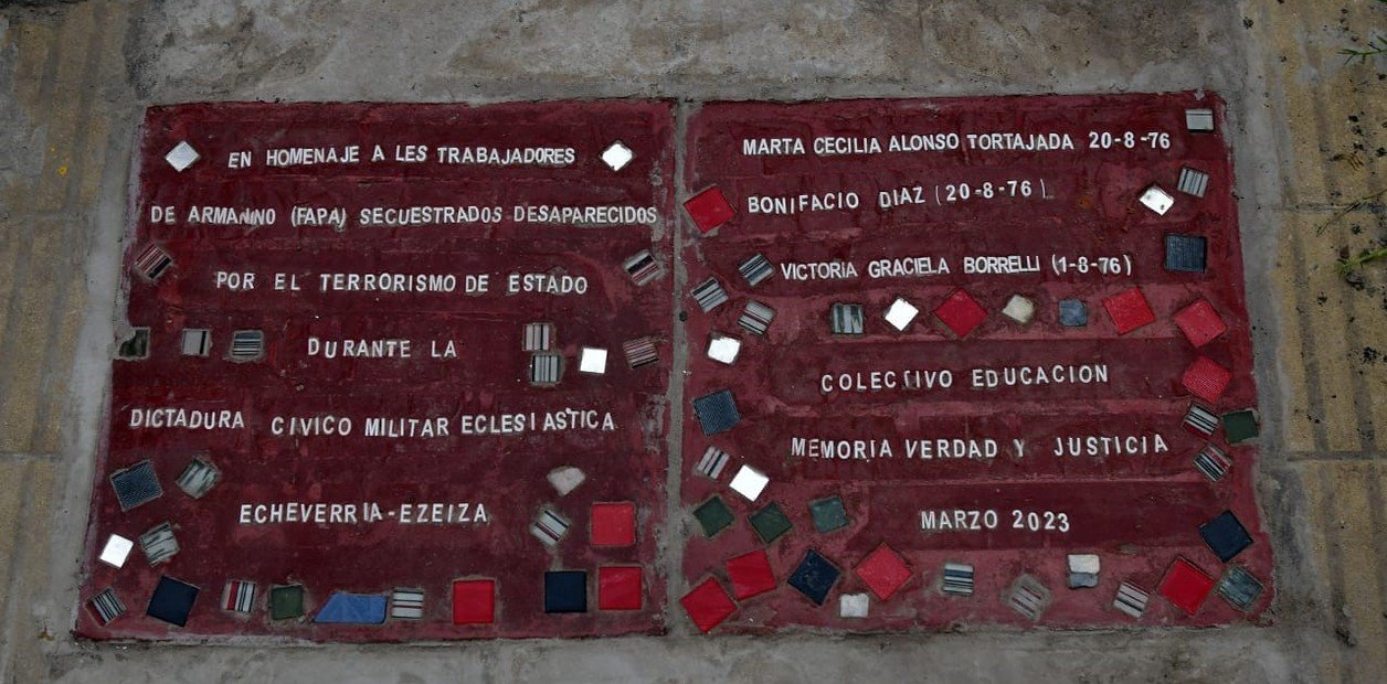 Homenaje reciente: Hace poco se colocaron baldosas blancas frente a donde funcionaba la fábrica en Monte Grande para señalizar su memoria. Es un ejemplo de cómo el barrio recupera su historia.