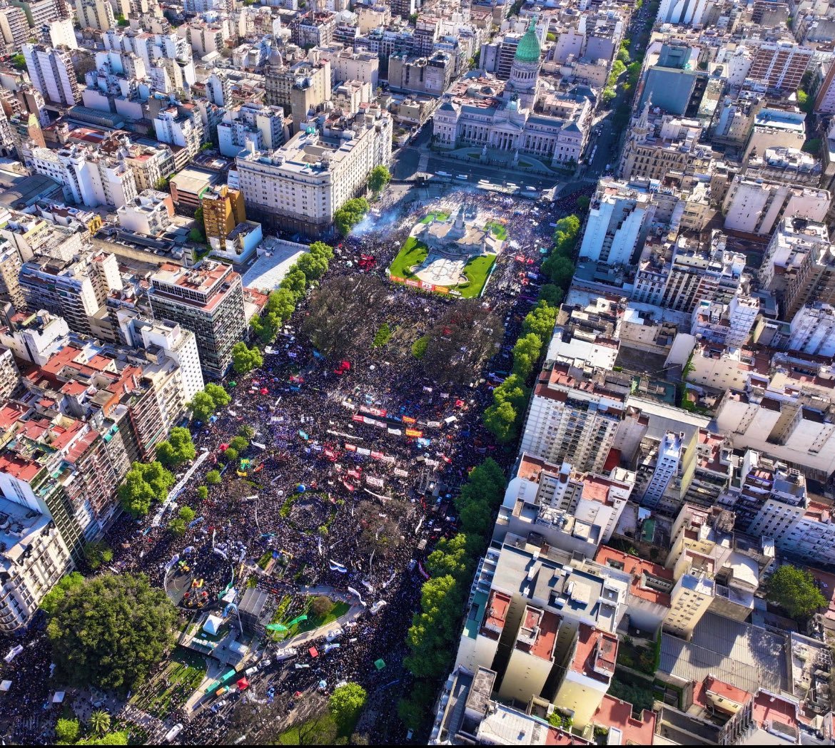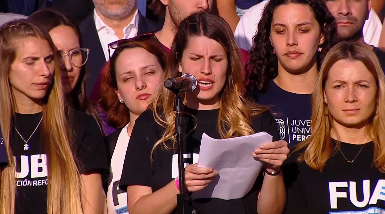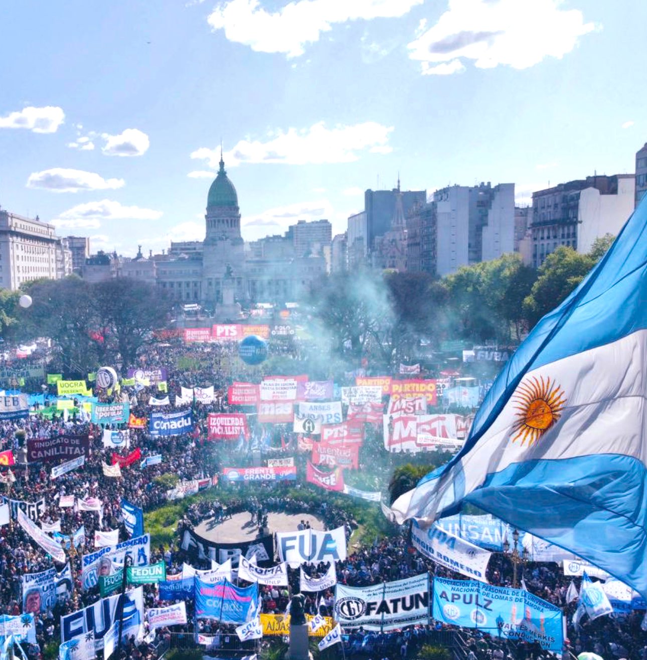 “Las fuerzas del cielo te están diciendo que defiendas la educación, porque vox populi, vox dei”, dijo a su turno uno de los oradores. La plaza de los dos Congresos está repleta de manifestantes y la marcha se replica en distintos puntos del país.