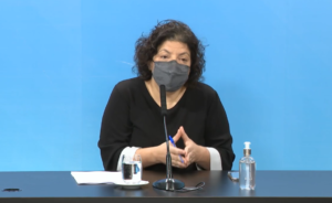 La ministra de Salud, Carla Vizzotti, dijo hoy que «por tercera semana están disminuyendo los casos de coronavirus en forma sostenida y profundizada» gracias «al fruto del esfuerzo de toda la sociedad», lo que se refleja en un «alivio del sistema de salud».