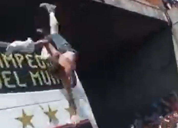En los videos es posible ver cómo, cuando el colectivo albiceleste va pasando por debajo de un puente, una persona trepada del lado de afuera de la baranda del puente se arroja sobre él con la fortuna de caer dentro del mismo. Inmediatamente, una segunda persona intenta hacer lo mismo, pero al lanzarse del puente rebota contra la parte trasera del micro y cae sobre el pavimento.