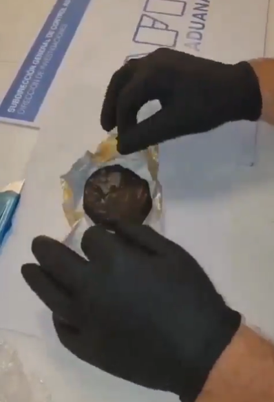 Se viralizaron las imágenes del personal de la policía aeroportuaria desarmando un alfajor Havanna de chocolate y dulce de leche que tenía cocaína en su interior.
