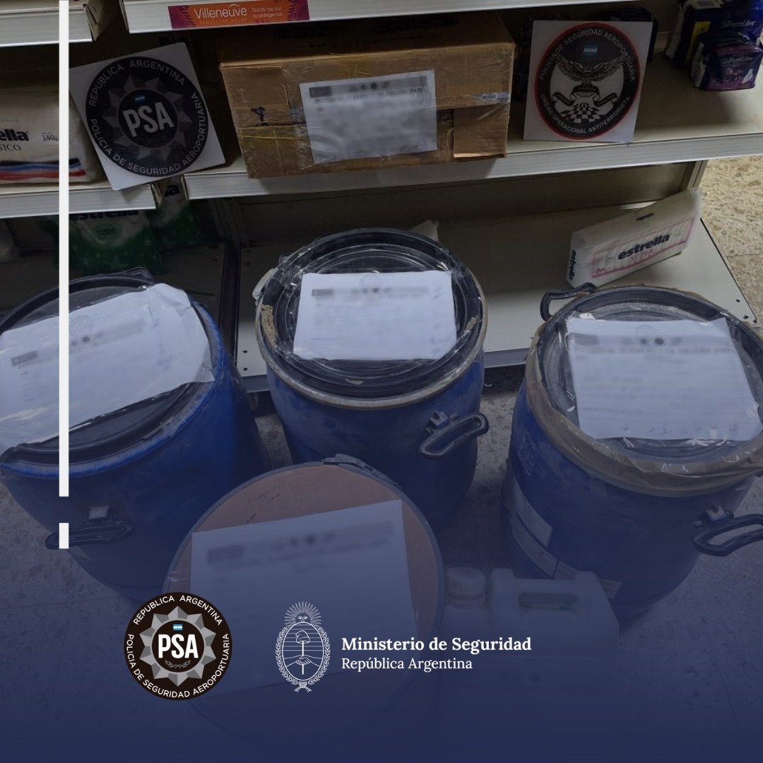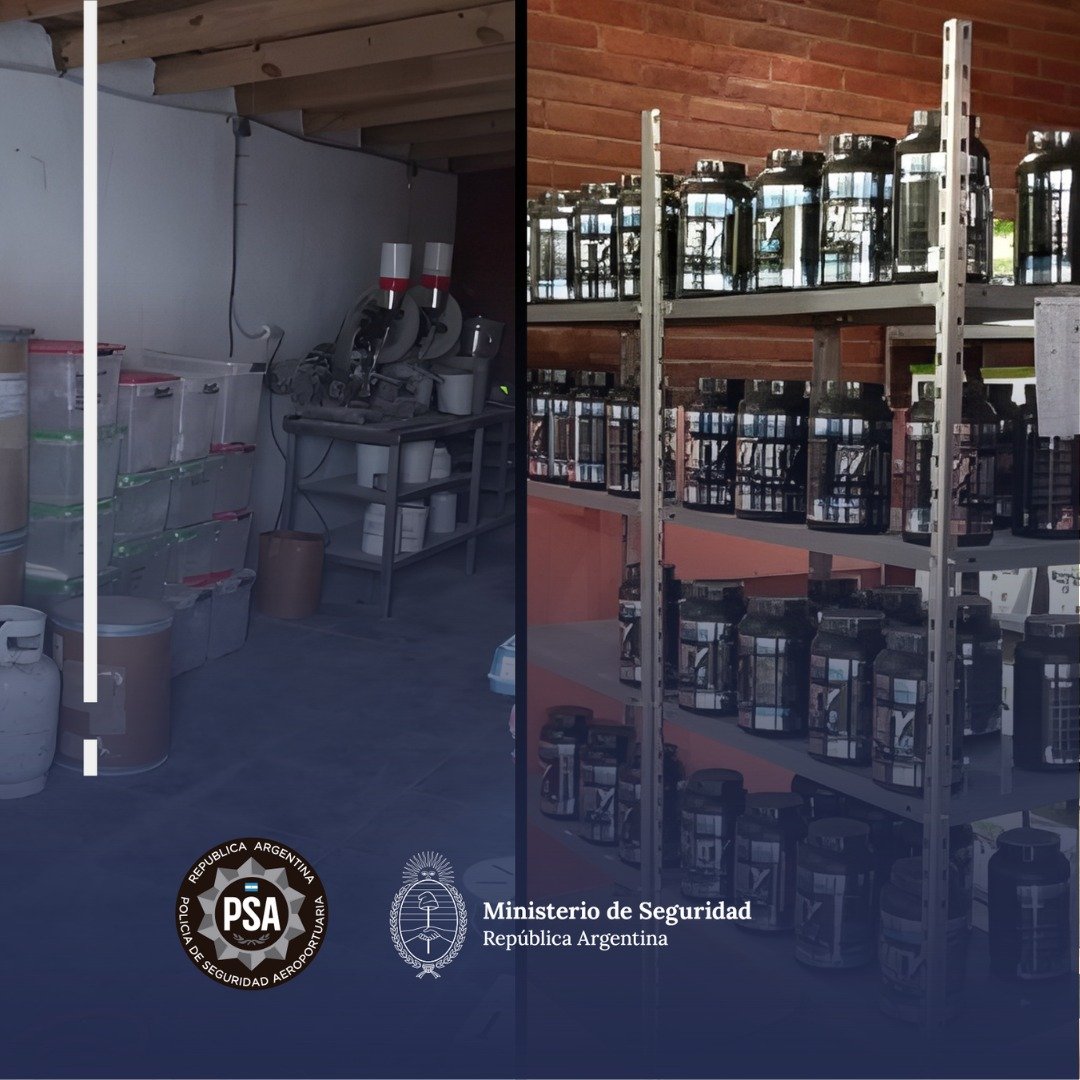 También decomisaron $19.302.765, U$S36.931, 9 armas de fuego largas y cortas, una réplica, 62 municiones, 3 cargadores, 10 balanzas, un horno, un compresor, una prensa, 5 máquinas para producir comprimidos, 11 placas de moldura con un delfín, decenas de bidones y tachos con sustancias químicas, elementos de corte y fraccionamiento.