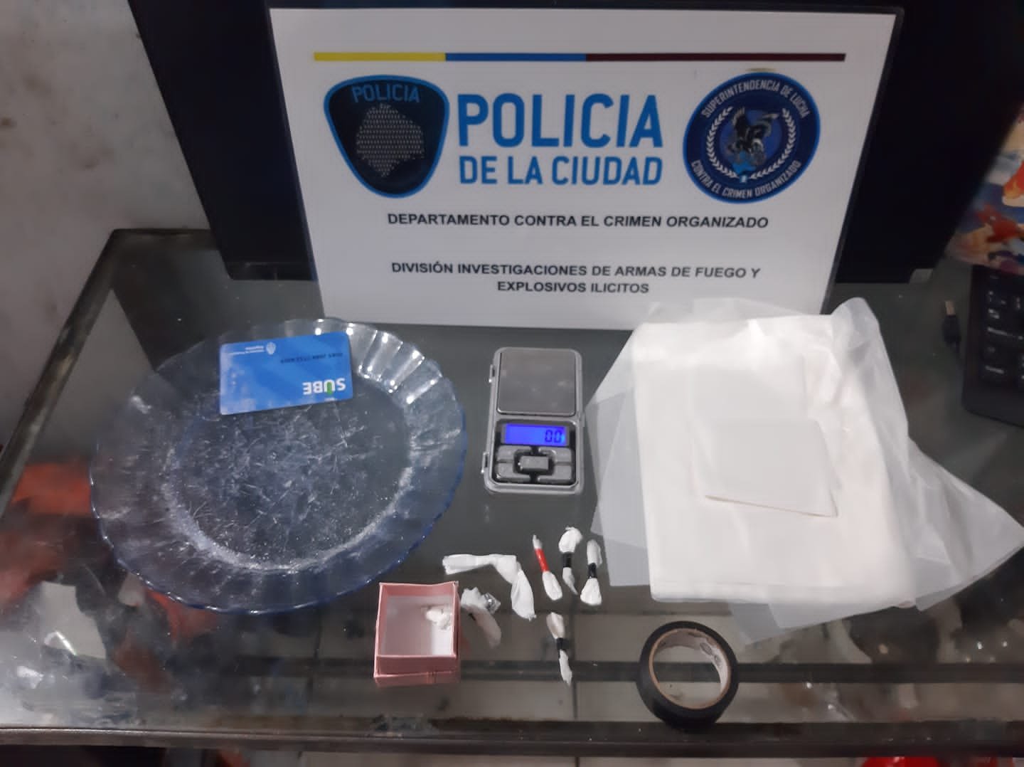 La Policía de la Ciudad se hizo presente en la vivienda donde se encontraron con la pareja del hombre, una mujer de 29 años de nacionalidad boliviana. Durante el operativo los oficiales incautaron 6 cargadores para distintos tipos de armas, un chaleco balístico robado a una efectivo de la Policía de la provincia de Buenos Aires, un par de esposas, 2 cintos de correaje, uno presuntamente propiedad de Gendarmería Nacional, un porta objetos tácticos, un peine plástico porta balas calibre 9 mm, 15 cartuchos de bala de distintos calibres, 6 de ellos percutados, un revolver, una caja para armas, 2 cachas de pistola, un chaleco refractario de una empresa de transporte de caudales, 6 dosis de cocaína por un peso aproximado de 1,4 gramos, una caja conteniendo una piedra de cocaína por un peso de 0,2 gramos, una balanza de precisión, gran cantidad de envoltorios de nylon para fraccionamiento de estupefacientes, anotaciones sobre comercialización de drogas, una fotocopia de un DNI a nombre de un tercero pero con la fotografía del detenido, 2 certificados de residencia con el nombre del implicado con la foto recortada, 4 sensores de movimiento, un domo WiFi, 4 alarmas sonoras aparentemente arrancadas, un frente de estéreo, 11 pendrives, 11 memorias micro SD y 8 celulares de distintas marcas y modelos, uno de ellos de alta gama bloqueado.