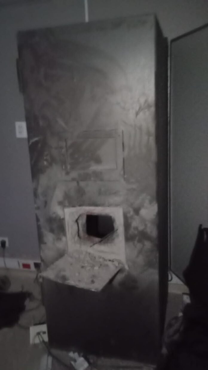 «Así mismo se constata que se encontraba con un boquete en uno de los techos del local y las cámaras de seguridad del lugar en el suelo.» Intervino policía científica y el hecho es materia de investigación.