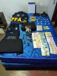 Además, hallaron tres pistolas calibre 22 de distintas marcas, 38 proyectiles calibre 22, un chaleco antibala sin numeración, dos gorras, una campera y un chaleco de la PFA, camisas de la Policía Bonaerense con escudo UTOI, y un estuche plástico vacío de kit RONI con sus respectivos folletos y una máquina de contar billetes.