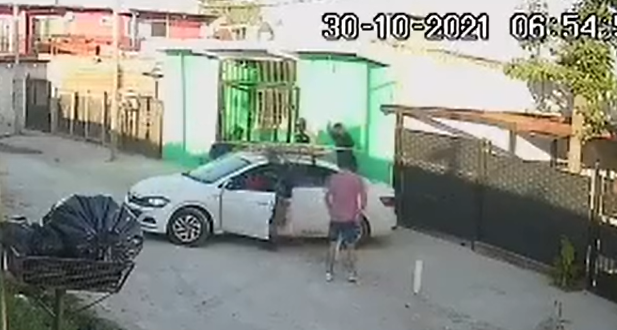 Según registró una cámara de seguridad de la zona, el hombre y sus acompañantes llegaron a subir a un Volkswagen Virtus color blanco y, cuando estaban por irse, fueron abordados por dos delincuentes armados.