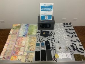 Además, se retuvieron 1 caja fuerte, un total de 26.580 pesos, 1 balanza digital, 1 trozo de marihuana (210.4 gramos), 1 envoltorio con cocaína (13.1 gramos), 13 pastillas de Lorazepam 2 mg, 2 teléfonos celulares, 1 envoltorio con recortes de cigarrillos de marihuana (2.2 gramos), elementos de cortes y fraccionamientos.