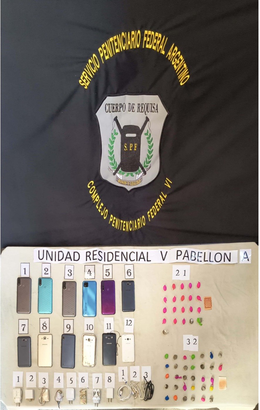 El primero de los procedimientos se desarrolló en el Complejo Penitenciario Federal VI (Neuquén), donde los agentes de la División Control y Registros que vigilaban el lugar para evitar el ingreso de elementos no permitidos, secuestraron 12 celulares ocho cargadores, tres cables USB y dosis de marihuana en el perímetro externo, ductos de ventilación y en el interior de siete celdas de uno de los pabellones.