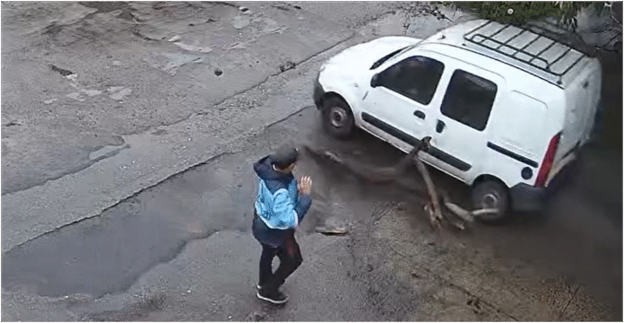 Lo que parece ser una escena de sabotaje vial es, en realidad, un mecanismo de «ingeniería delictiva». Un grupo de atacantes, actuando al descubierto pero con la velocidad de una emboscada, utiliza un pesado tronco de árbol para impactar directamente contra los vehículos que se dirigen a la megaferia de La Salada.