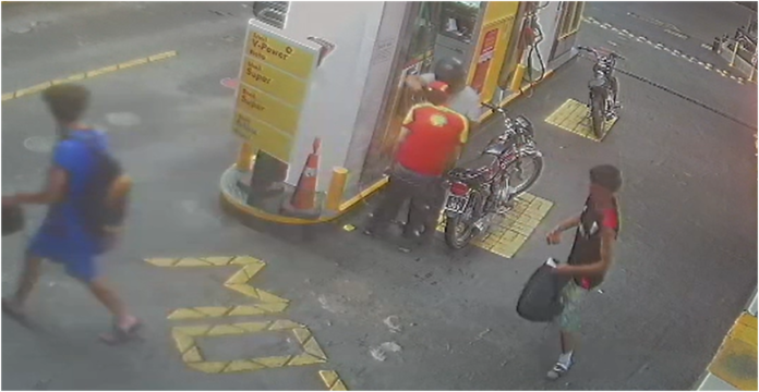 El hecho, que quedó registrado por las cámaras de seguridad del establecimiento, ocurrió cuando el malviviente arribó al lugar a bordo de una motocicleta Honda CG Titán gris, la cual presentaba la particularidad de estar «desnuda» (sin plásticos y solo con el tanque colocado).