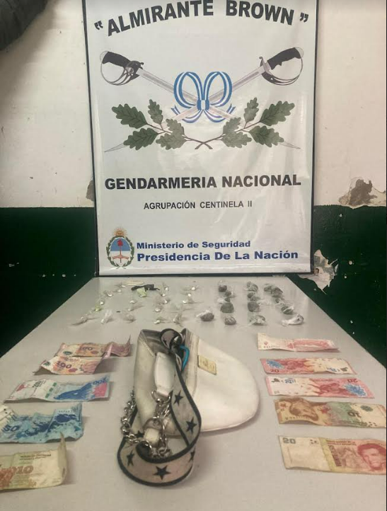 El hallazgo se produjo en la intersección de las calles Madariaga y Moyano, donde personal de la fuerza nacional visualizó un motovehículo en el que viajaban un hombre y una mujer, quienes alertados por los gendarmes se dieron a la fuga descartando un bolso que contenía envoltorios de nylon transparente, presuntamente con droga, además de dinero en efectivo.