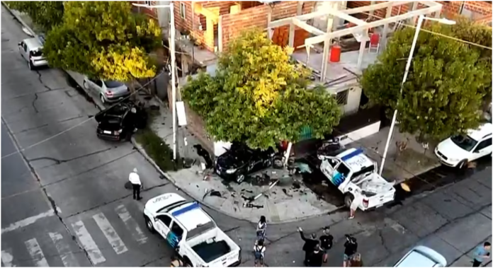 Producto de la velocidad, el patrullero impactó contra un auto particular que se encontraba estacionado. El choque fue de tal magnitud que el móvil policial volcó, mientras que el vehículo embestido fue desplazado hacia adelante, rompiendo la pared de una casa e ingresando al jardín delantero.
