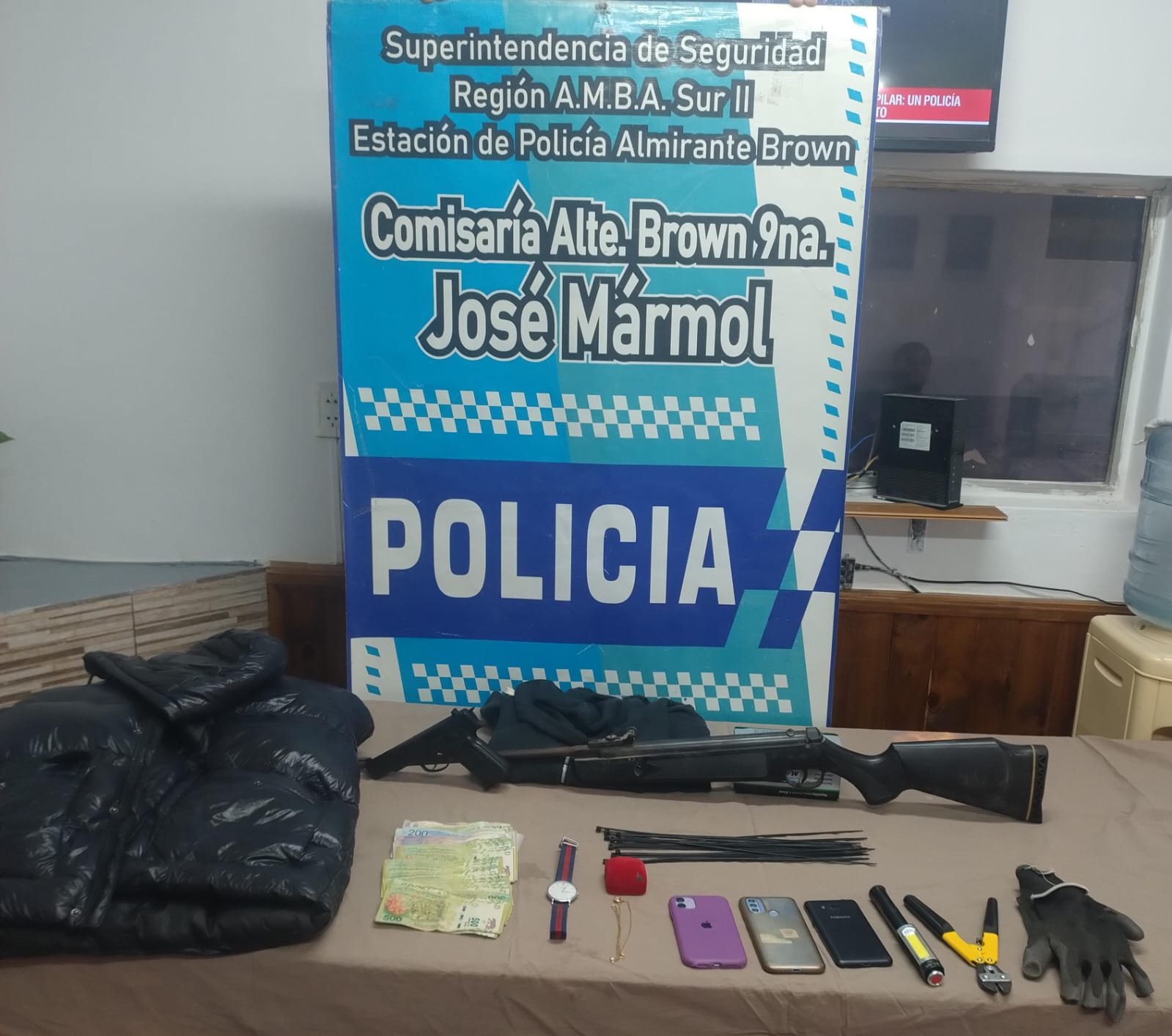 Luego de una serie de allanamientos por una entradera a la casa de una señora de 89 años en Almirante Brown, en el sur del Gran Buenos Aires, efectivos de la Policía Bonaerense detuvieron a un joven de 20 años con una pistola réplica 9 milímetros, una carabina, guantes, precintos y un auto que tenía pedido de secuestro por un robo en Quilmes.