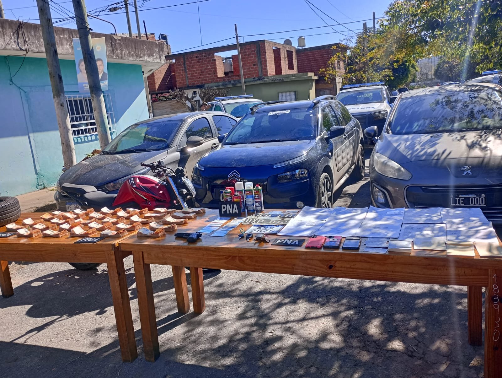 Según se informó, como resultado de la requisa se hallaron a los ocupantes del vehículo abandonado, y se constató que en el garage del domicilio había más vehículos con dominios que no correspondían, a la vez que en la casa se encontró dinero en efectivo, replica de arma de fuego y licencias de conducir apócrifas.