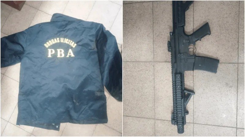 La víctima contó a los efectivos que el atacante tenía un arma de fuego en su poder (rifle de aire comprimido), por lo que accedió al ingreso de los mismos a su propiedad para el correspondiente secuestro de la misma. Los numerarios también incautaron debajo de la cama del imputado otros elementos (campera de la Policía Bonaerense con jerarquía de capitán, otra con la inscripción de Drogas Ilícitas, gorra de la Policía de Investigaciones y una funda de chaleco anti balas).